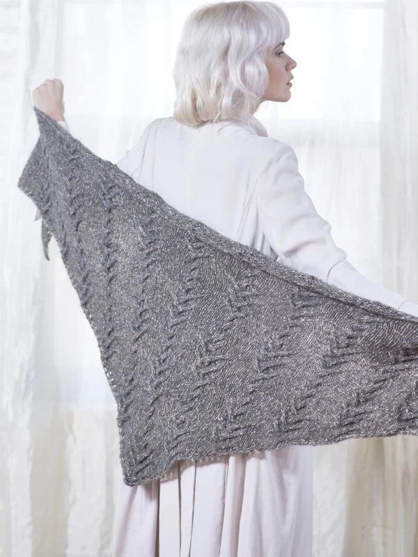 A unique cable pattern adorns this triangular shawl knitting pattern, knit from the center point up and out. The stitch pattern is charted