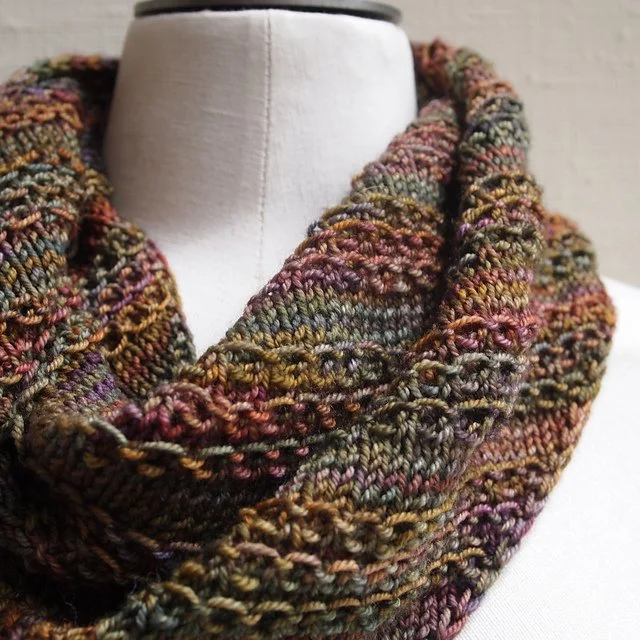 I used sock yarn and made a skinny double loop because she wanted more of an accessory than a keep-warm cowl. You could easily use a different yarn weight or make a different size - double or single loop. The pattern provides gauge and size info for Mum’s version, but also includes tips on how to adjust for other yarn weights and sizes - but don’t forget changes will affect yarn requirements.